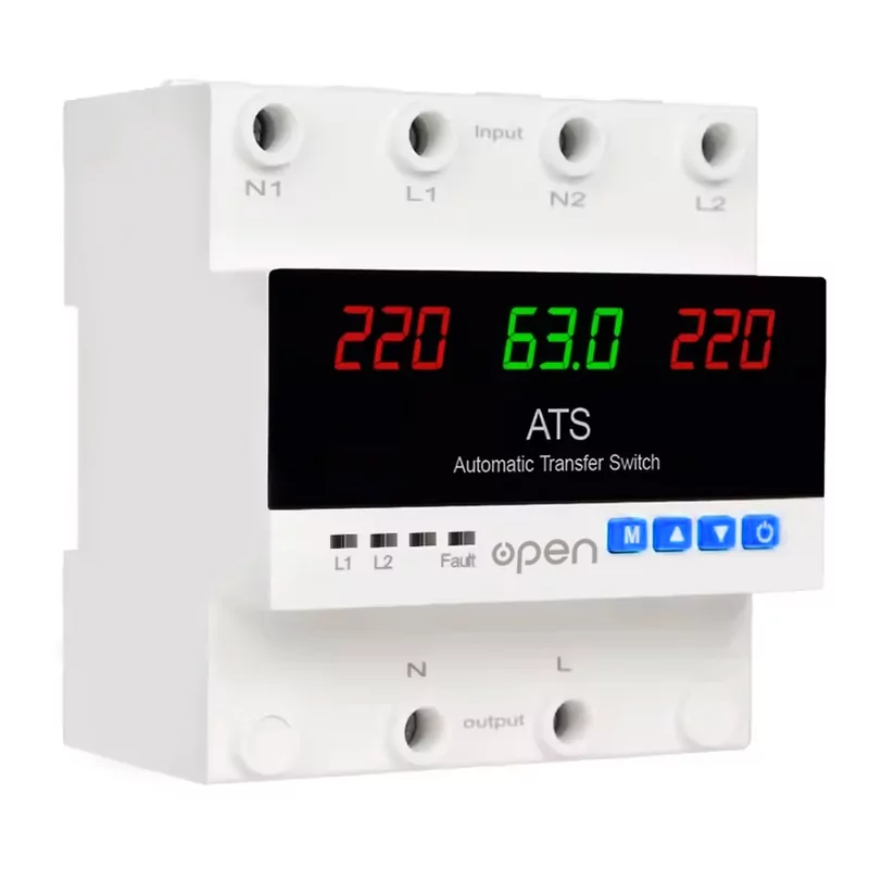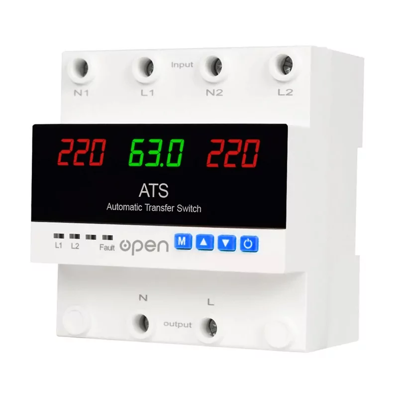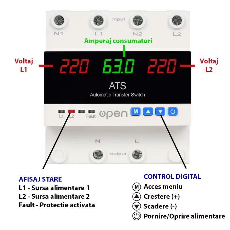 Acest dispozitiv este un releu electronic de protecție și comutare automată între două surse de alimentare (L1 – principală, L2 – rezervă).