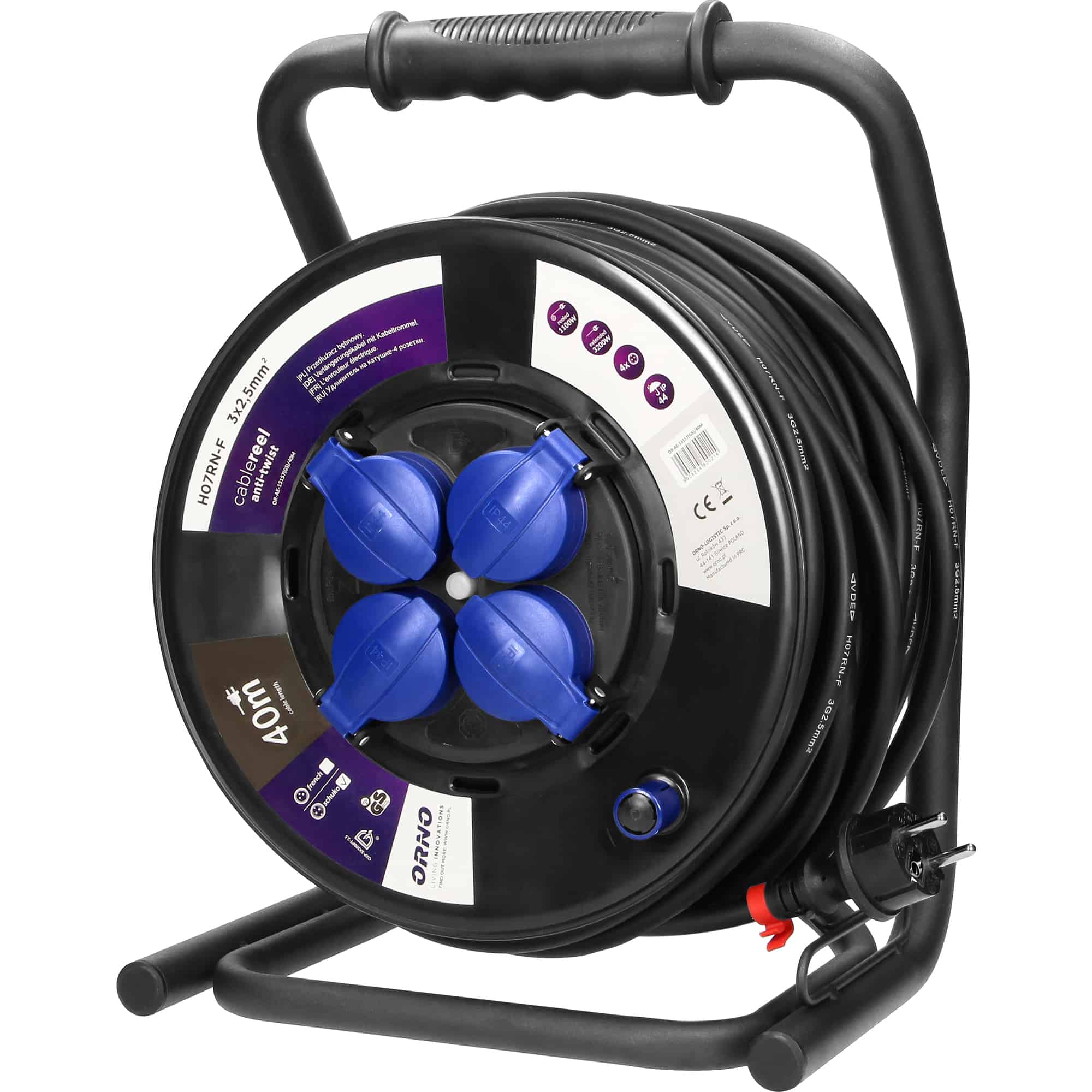 Derulator tambur cu sistem inovator anti-rasucire (prize fixe), suport metalic CUBE unic si protectie la suprasarcina (comutator termic). Echipat cu cablu H07RN-F din cauciuc, rezistent la ulei, cu o lungime de 40 m. Are 4 prize cu impamantare (tip shucko) si obturatoare si capace de protectie impotriva prafului, murdariei si apei. Maner foarte util din cauciuc, manivela pentru derularea cablului, sistem de blocare si mufa izolata IP44. Destinat utilizarii in conditii dure si in spatii exterioare. Electric Casa recomanda derulator tambur PVC Orno.