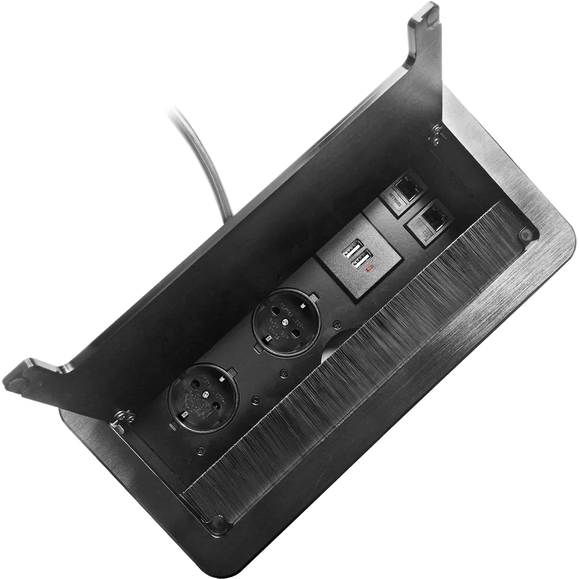 Set de trei prize de tip 2P+E, in carcasa superioara retractabila cu perie anti-praf. Echipat cu cablu de 1.5 m lungime. Destinata pentru instalarea in interiorul biroului, blatului de lucru si a meselor, atat vertical cat si orizontal, oferind acces usor la prizele electrice. Electric Casa recomanda multipriza 2 posturi Orno.