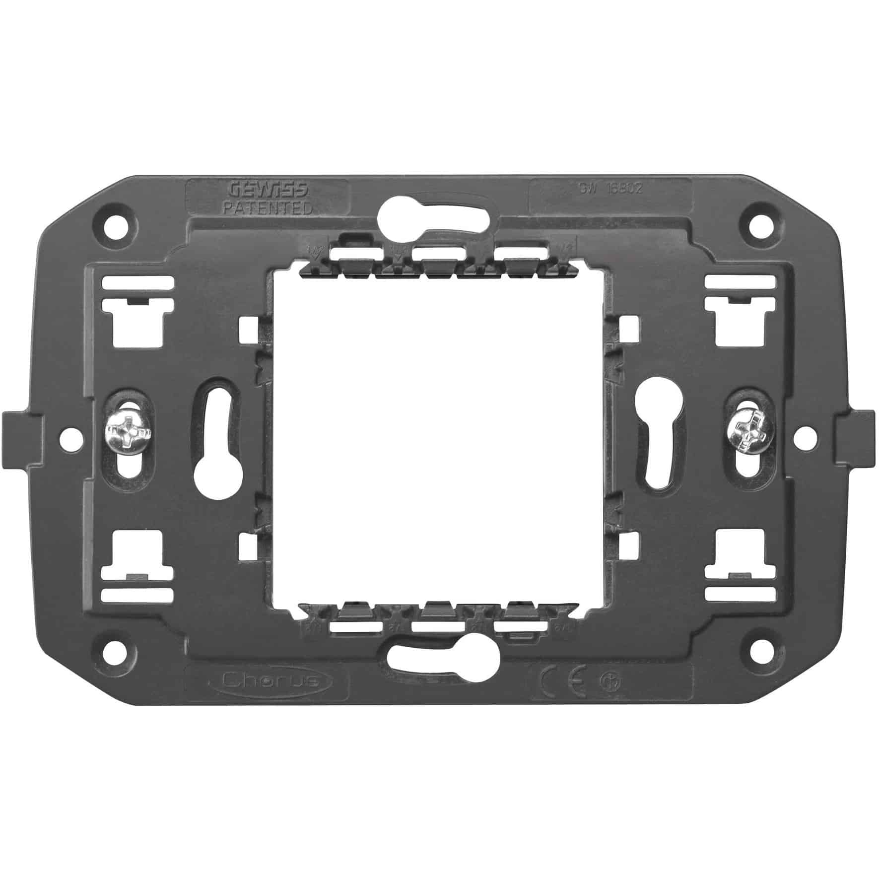 Caracteristici: GW16802 montat pentru fixarea atât a cutiilor dreptunghiulare cu 3 ganguri (distanță centrală 83,5 mm), cât și a cutiilor rotunde / pătrate (distanța centrală 60 mm) echipate cu coloane de fixare. A fi completat cu plăci italiene standard cu 2 ganguri. Note: GW16808 și GW16812 pot fi utilizate în combinație cu plăcile Chorus ONE (alb de lapte sau titan).