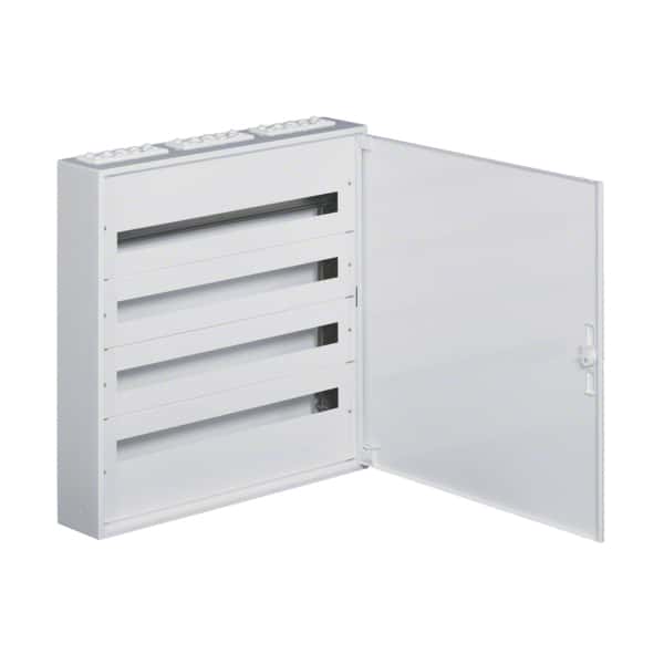 Pentru aparataj modular pana la 125A, Clasa de protectie I, Grad de protectie: IP40, Culoare: alb pur (RAL9010), Norme: EN61439-3, Tablou de distributie complet cu fante de prindere continue si capace de protectie impotriva contactului cu table metalice, Distante intre sinele DIN de 150mm, Forma de livrare fara cleme fara/nul, Compartiment de cabluri acces si iesire. Electric Casa recomanda produse Hager.
