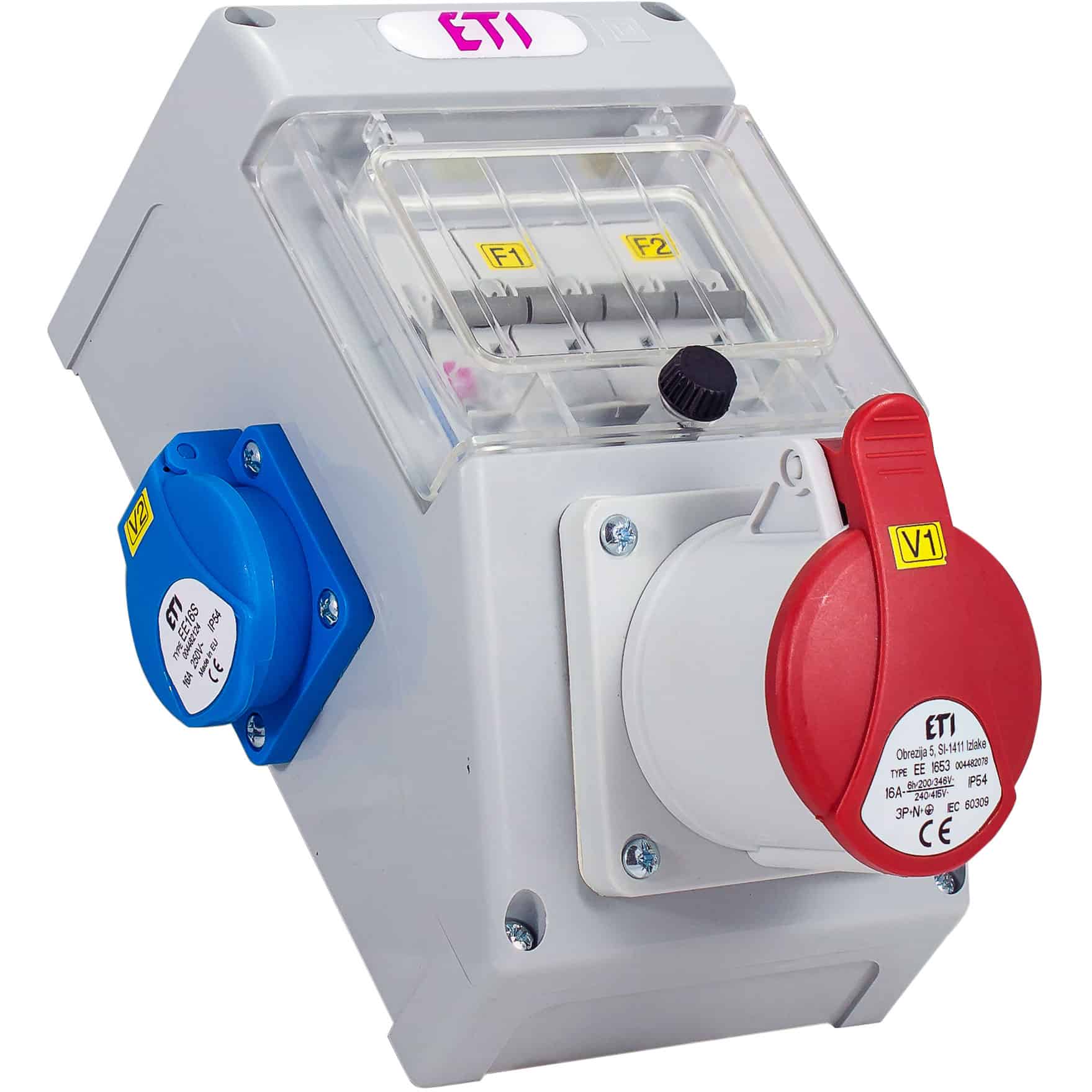 Echipat cu: 2 prize schuko de 16A si 1 priza 3P+N+E de 16A. Electric Casa recomanda tablou organizare santier trifazic/monofazic ETI.