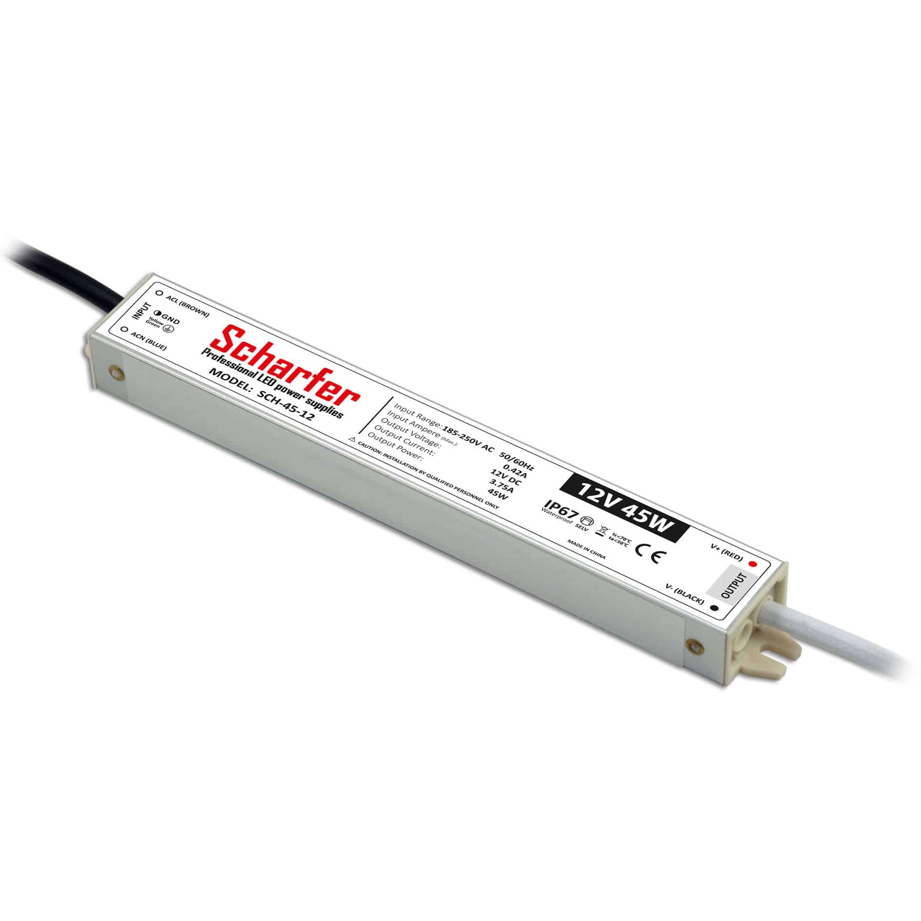 Sursa de alimentare banda Led 12V profesionala marca Scharfer: este proiectat pentru a fi utilizat atat la interior cat si la exterior in conditii de mare umiditate (grad de protectie IP67). Poate alimenta benzi Led de putere pana la 45W, cu un curent maxim de 2.5A.